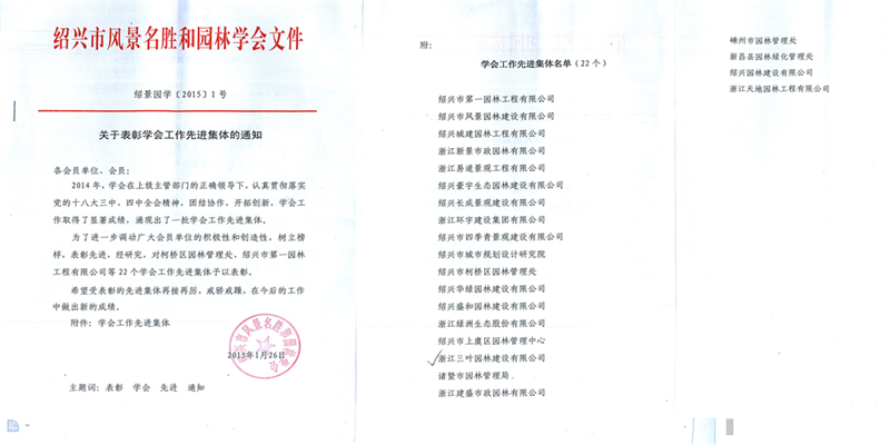 - 三葉園林榮獲"紹興市風景園林學會工作先進集體"