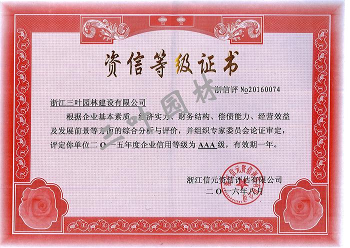 每一年度的“AAA級信用企業(yè)”評選是授權(quán)權(quán)威中介機構(gòu)認定,并根據(jù)企業(yè)基本素質(zhì)、經(jīng)濟實力、經(jīng)營管理、財務狀況、償債能力、經(jīng)濟效益及發(fā)展前景等方面進行綜合分析和評定,并組織專家委員會認證審定,是園林行業(yè)信用等級最高的一項榮譽。“AAA級信用企業(yè)”稱號的獲得,是代表企業(yè)信用程度高,合同履約能力強、經(jīng)營狀況佳,盈利能力強,發(fā)展前景廣闊等綜合實力客觀贊譽。是對三葉園林長期堅持的“誠信服務為中心”企業(yè)理念的肯定和認可。對企業(yè)在品牌形象宣傳、政策扶持、供銷采買、招標投標、市場準入、資質(zhì)審核、信貸融資、經(jīng)營管理價值等方面經(jīng)營和市場活動中獲得優(yōu)先權(quán)。