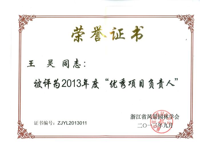 近日,根據(jù)《關(guān)于開(kāi)展2013年度浙江省“優(yōu)秀園林工程”獎(jiǎng)評(píng)審工作的通知》及《關(guān)于2013年度浙江省“優(yōu)秀園林工程獎(jiǎng)”分設(shè)獎(jiǎng)項(xiàng)申報(bào)評(píng)審的補(bǔ)充通知》“2013年度浙江省優(yōu)秀園林工程”金獎(jiǎng)項(xiàng)目獲得企業(yè)填報(bào)和學(xué)會(huì)審核,授予王靈同志為2013年度浙江省風(fēng)景園林學(xué)會(huì)“優(yōu)秀項(xiàng)目負(fù)責(zé)人”稱號(hào),現(xiàn)予公布表彰。希望王靈同志,再接再厲,進(jìn)一步提升項(xiàng)目管理水平,確保施工工程質(zhì)量,創(chuàng)建更多的園林精品項(xiàng)目,為園林綠化事業(yè)作出更大貢獻(xiàn)。