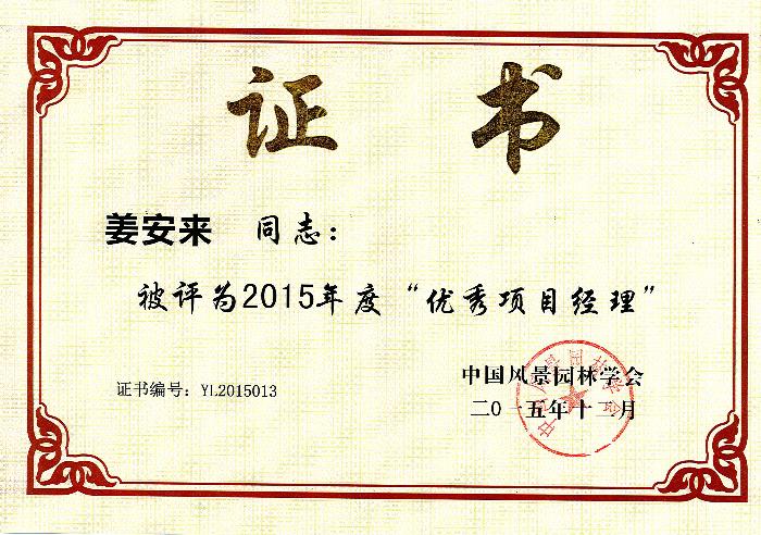 - 12月21日,中國風(fēng)景園林學(xué)會“優(yōu)秀項目經(jīng)理”頒獎大會在合肥市安徽高速開元國際大酒店隆重召開。浙江三葉園林建設(shè)有限公司工程部經(jīng)理吳惠芬應(yīng)邀出席。來自全省各地的省風(fēng)景園林學(xué)會會員單位代表、獲獎單位代表等參加了大會。大會首先宣讀了獲獎文件:《關(guān)于授予“2015年度中國風(fēng)景園林學(xué)會 《優(yōu)秀項目經(jīng)理》”名單的通知》接著,舉行了隆重的頒獎儀式。其中,浙江三葉園林建設(shè)有限公司工程師姜安來同志獲評2015年度“優(yōu)秀項目經(jīng)理”。2015年,對建設(shè)美麗中國的大步推進,三葉園林積極探索、創(chuàng)新發(fā)展,夯實前進,在項目管理、提高施工質(zhì)量和在繼承、創(chuàng)新、建造節(jié)約型園林、爭創(chuàng)“優(yōu)秀園林工程”為生態(tài)中國的建設(shè),再添光彩!