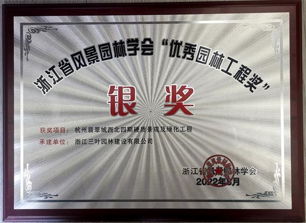 2023年12月14日,第十二屆“園林人居”論壇暨2023年度浙江省風(fēng)景園林學(xué)會(huì)優(yōu)秀園林工程獎(jiǎng)?lì)C獎(jiǎng)大會(huì)在杭州圓滿(mǎn)召開(kāi)。會(huì)上宣讀表彰了“2023年浙江省優(yōu)秀園林工程獎(jiǎng)獲獎(jiǎng)項(xiàng)目的通知”,全省共有306個(gè)項(xiàng)目分別獲規(guī)劃設(shè)計(jì)獎(jiǎng)、施工類(lèi)(金、銀、銅)、養(yǎng)護(hù)類(lèi)獎(jiǎng)項(xiàng),其中三葉園林承建的杭州翡翠城西北四期硬質(zhì)景觀及綠化工程獲得省“優(yōu)秀園林工程”銀獎(jiǎng)。